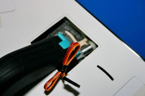 Also die mit uhu endfest 300 in die Zahnkranzaufnahme geklebte Welle in die Rudertasche eingefädelt und das Servo aufgesteckt. Nach ein paar Ruderbewegungen lag die Servoposition fest und wurde mit Bleistift markiert. Dann Servorahmen wieder raus, das Servo mit Grundierwachs einbalsamiert, damit Klebereste nicht daran festkleben und den Servorahmen sparsam mit endfest 300 benetzt. Wieder zurück damit in den Servoschacht, Servo aufstecken und Rahmen an der Markierung positionieren und festhalten. Testweise Ruderbewegungen bestätigten die Servoposition die sogleich mit einer großen Leimzwinge fixiert wurde (Stryopor auf der Gegenseite zur Verhinderung von Druckstellen natürlich nicht vergessen). Die überstehenden Harzreste am Rand des Servorahmen verteilen, damit eine gute Verklebung gewährleistet ist. Letzter Test ob mit dem Servotester der Ausschlag stimmt und alles sauber läuft. Das Ganze wurde über Nacht zum aushärten so belassen.