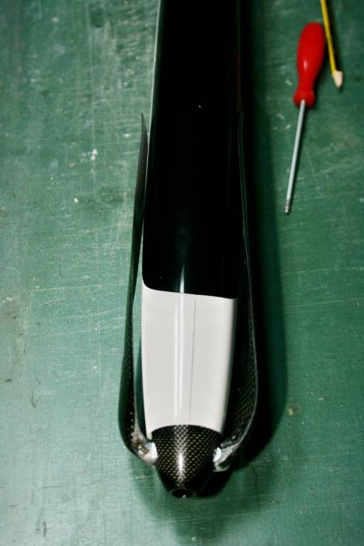 Zuerst musste sich der Rumpf einer Nasen-OP unterziehen. Die Trennstelle wurde grob auf den mit Kreppband getapten Rumpf angezeichnet und danach wurde die Nase kurz und schmerzlos mit meinem Akku-Multitool abgesägt. Da das Multitool gerade auf dem Tisch lag, wurde der Haubenausschnitt ebenfalls erweitert, damit der 6s3800mAh Lipo mitsamt Regler hineinpasst. Das hat mir das Sägeblatt etwas übel genommen sodass es an einigen Stellen nunmehr ziemlich ausgelutscht ist. Das ist halt der Nachteil an GfK, es ist ein rechter Sägeblattfresser.