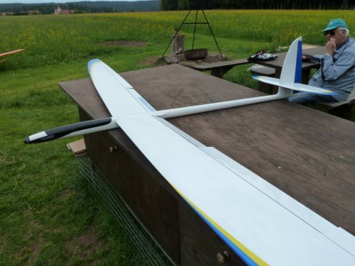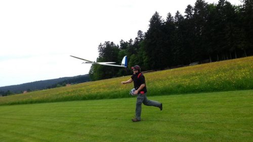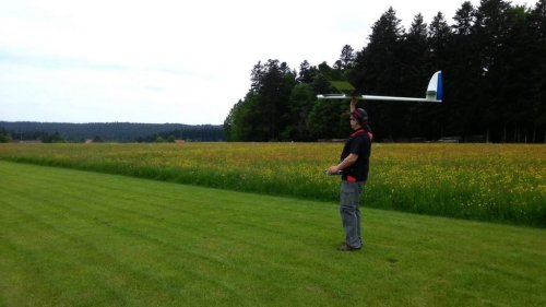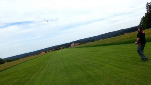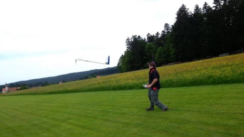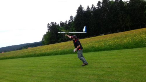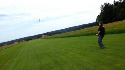 Am Samstag war es endlich soweit. Nach gut einem Monat "Bauzeit" konnte der Erstflug des Skywalker erfolgen. Der Erstflug war aber mit einigen Unwegbarkeiten behaftet. So konnte ich nicht wie geplant auf den GPS-Logger 2 zurückgreifen, da er Tags zuvor beim Absturz der ASK 18 beschädigt wurde und bereits auf dem Weg zur Reparatur war. Der ersatzweise hizugezogene UniSens-E weigerte sich standhaft Vario- bzw. Höhendaten auszugeben, weshalb der Erstflug in Oldschool-Manier, ganz ohne Vario erfolgte. Man glaubt es kaum - das geht auch.