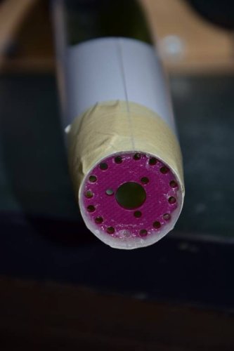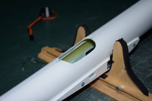 Am Rumpf wurde auch schon angefangen. Die Rumpfspitze musste weichen, weil diesen Platz der 35mm Reisenauer Spinner einnehmen wird. Der Motorspant wurde auf den nötigen Durchmesser von etwa 33mm angepasst, eingepasst und mit Sekundenkleber fixiert. Abschließend wurde mit Baumwollflocken eingedicktes Harz zur finalen Verklebung aufgebracht.