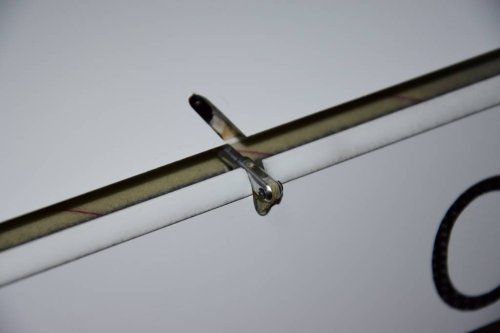 Die Anlenkungen mit den KST-Flächenservos sind wirklich toll geworden. Spielfrei und hart, so soll es sein. Die Restbestände an IDS-Servoarmen sind einfach klasse geeignet und prima zu verarbeiten zusammen mit den alten Skywalker RDS-Gegenlagern. Aber im Fundus sind auch noch Gegenlager (Halbschalen mit Kugellager) von Memo, die fast noch besser sind. Also genug Material für künftige Projekte. Die Alu-Gabelköpfe am Ruderhebel sind sehr solide nur die Arretierung der Bolzen mit winzigen Sicherungsscheiben ist Feinmechanik und erfordert eine ruhige Hand und ein gutes Auge (oder eine gute Lesebrille). Die Gestängelänge (Achse zu Achse beträgt 55mm beim Querruder und 60mm bei der Wölbklappe).