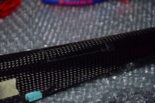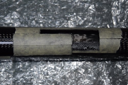 Die Befestigung des Bowdenzugrohres im Rumpf selbst war auch etwas abenteuerlich. Ein NAchteil am Carbonrumpf ist der, das es innen zappenduster ist und auch eine starke LED-Taschenlampe nicht weit hineinleuchten kann. Abhilfe hat meine USB-Endoskopkamera geleistet, die am Tablet angeschlossen war und Bilder aus dem inneren zeigte. Das Bowdenzugrohr wurde mit Powermagneten an der Rumpfwand fixiert und Harz anschließend über einen an einer 6ml Spritze angebrachten PVC-Schlauch injiziert. Hierbei war die Kamera rund 6cm vor dem Schlauchende fixiert, sodass ich live im inneren das Harz dosieren konnte und sichergestellt war, dass es am richtigen Platz landet. Bilder von der Liveübertragung gibt es leider keine, da keine Hand frei war. Das Harz wurde von der Serviceklappe und von der Seitenflosse aus eingebracht womit das Bowdenzugrohr nun wunderbar fixiert ist.