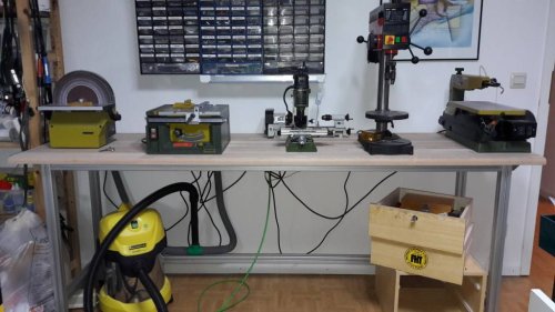 Mein alter Maschinentisch in der Werkstatt hat schon einige Jahre auf dem Buckel, stammt der Schreibtisch, der als Basis dient, noch aus den Achtzigern. Zudem ist er etwas zu klein und bietet daher nicht genügend Platz für meinen mittlerweile angewachsenen Maschinenpark. Auch die MPX-Platte zur Erweiterung reicht nicht mehr aus und schwingt am Rand recht unangenehm. Höchste Zeit also für soliden und dauerhaften Ersatz.