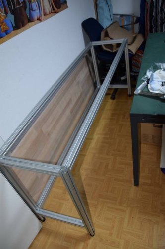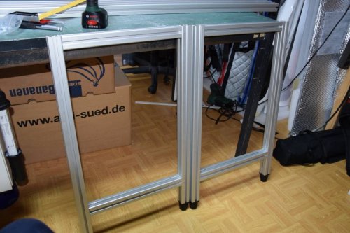 Also fiel die Wahl beim Untergestell auf 40mm Aluprofil (I-Typ). Dieses bekommt man in vielen Webshops auf Maß zugesägt und das nötige Zubehör wird gleich dazu angeboten. Als Platte wurde eine 27mm Buche-Massivplatte auserkoren mit 60x240cm Rohmaß und einer abgerundeten Kante. Nachdem alle Materialien eingetroffen waren, konnte die Montage des Untergestells beginnen.
