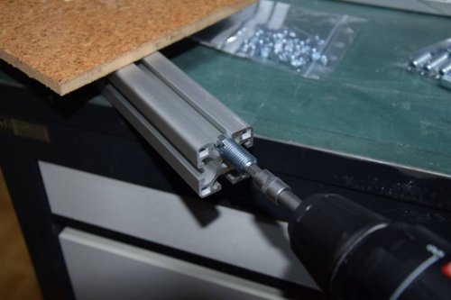 Die Tischplatte selbst wird über Winkel am Profil befestigt. Die Spaxschraubenlöcher an der Tischplatte habe ich vorsichtshalber mit 3mm vorgebohrt.