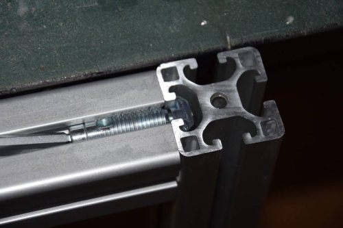 Zur Verbindung der Profile untereinander verwende ich die speziellen Profilverbinder. Hier wird der Träger mit Schraube mittels Linksgewinde in einen der Profilflügel geschnitten (WD40 dient wieder als Schneidöl). Um einen guten Halt zu gewähren hab ich jeweils zwei Verbinder in die gegenüberliegenden Profilflügel eingeschraubt. Nach dem durchdrücken der Schraube wird die Nutmutter aufgedreht und das Profil kann in die Profilnut des zu befestigendes Stranges geführt werden. Mit einem 5mm Inbusschlüssel wird die Verbindung fixiert und die Sache hält bombenfest.