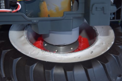 Die Motoren wurden in ein erwärmtes HT-40 PVC-Rohr eingeschoben und halten bombenfest. Diese Konstruktion wurde dann in die entsprechend freigemachte Stelle im Fahrzeugunterteil eingeschoben und dort mit Stabilit Express verklebt.