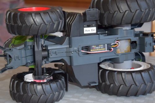 Als Antrieb kommen zwei 12V Getriebemotoren (RB35 Klone) zum Einsatz die etwas mehr als 60 Umdrehungen/min bringen. Das sorgt für viel Kraft bei einer moderaten Geschwindigkeit. Jeder Motor wird über einen separaten Regler angesteuert. Die Stromversorgung übernimmt ein 3s LiIon Akku mit 2,2 Ah. Dieser ist im Bereich des Motors diskret unter der Frontklappen beheimatet. Die beiden Fahrtregler, von denen einer die Stromversorgung der RC-Anlage übernimmt, sind im mittleren Bereich unter dem Fahrerhaus untergebracht.