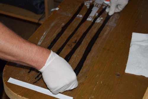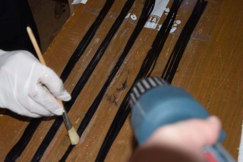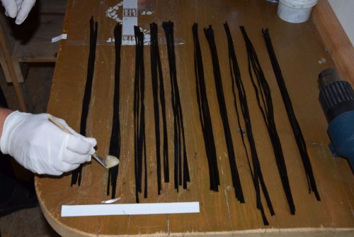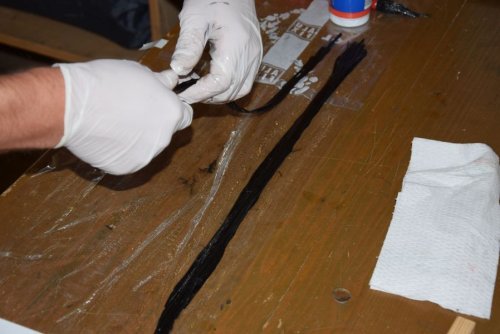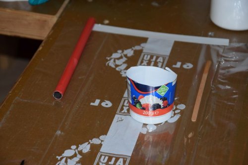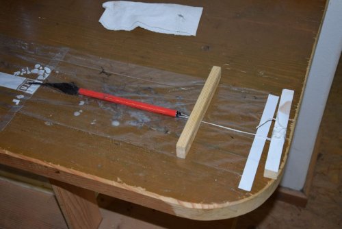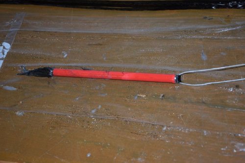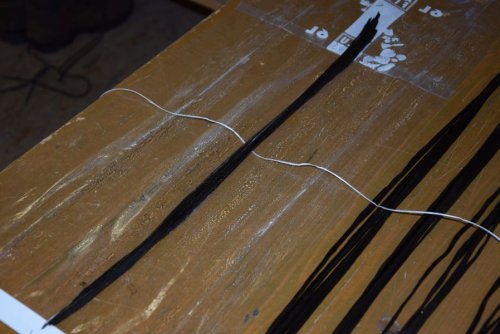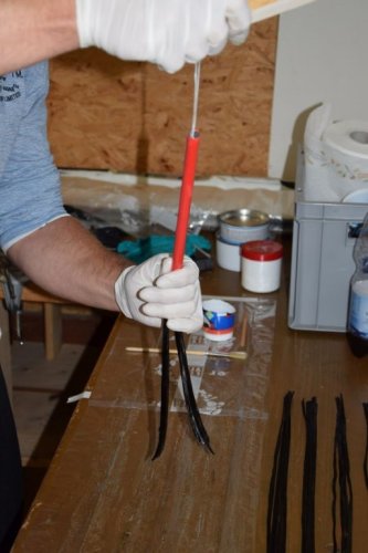 Also schnell Harz angemacht, erwärmt und die Rovings auf Frischhaltefolie getränkt. Danach wurden sie zu einem großen Pack zusammengfasst und in der MItte eine Schnur durchgezogen, die dann durch das Rohr gepfriemelt wurde. Dann noch ein Zugholz um die Schnur und gaaanz viel Kraft eingesetzt. Nach einigen Kraftakten war dann die Kohle im Rohr.