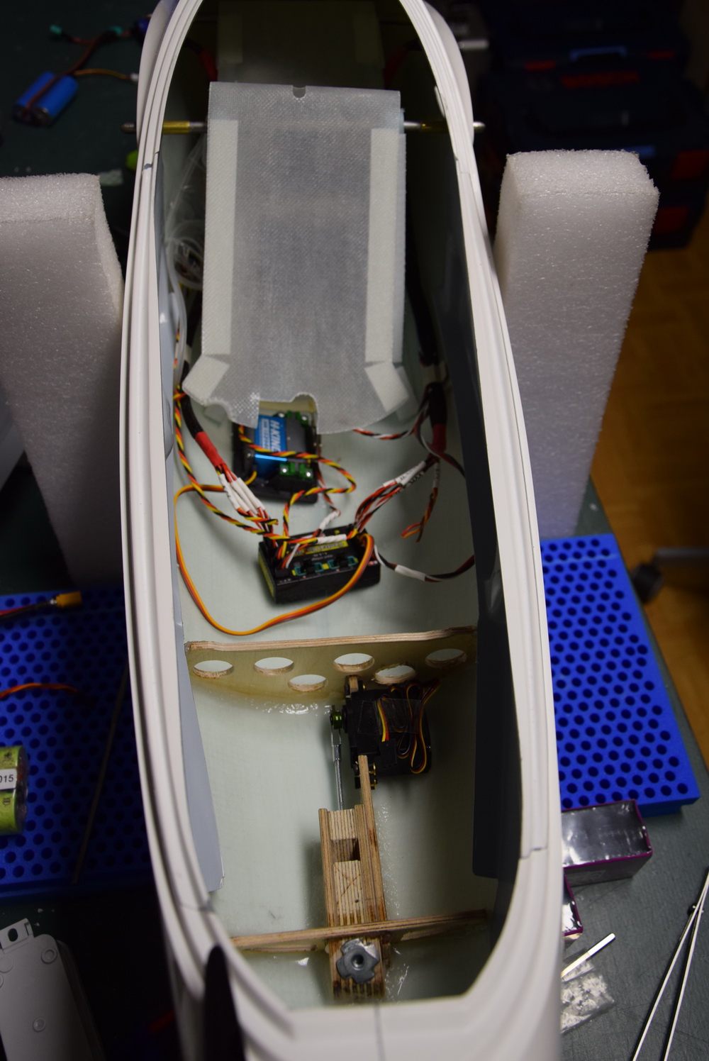 Die Akkubefestigung ist mittlerweile gelöst. Die Antriebsakkus werden mit großflächig angebrachtem Klettband an der Rumpfwand fixiert. Zusätzlich werde ich noch eine kleine Sperre einkleben, um ein verrutschen nach vorne zu verhindern.