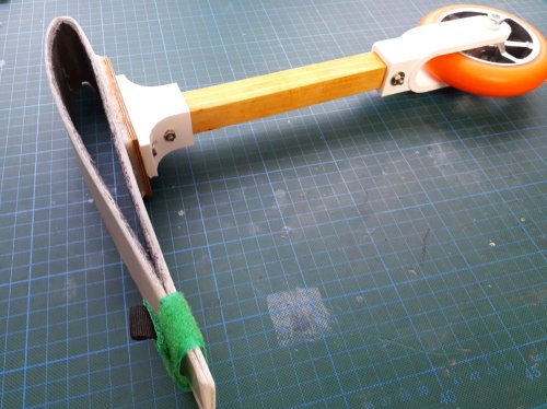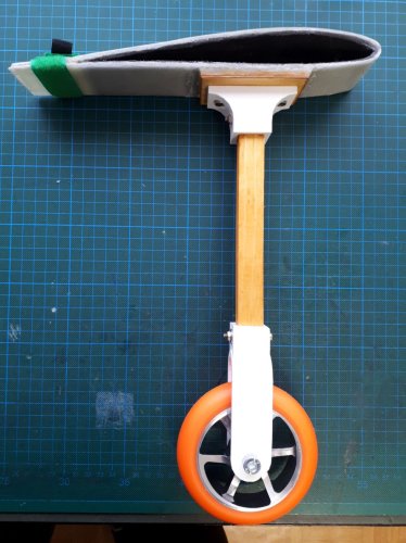 Der Shark ist mit seinen 14,5kg schon ein recht schwerer Brocken, den ich nicht gerne auf der Schulter tragen möchte. Daher liegt die Verwendung eines Stützrades nahe. Da ich mit meinem 3D Drucker mal was komplett selbst konstruiertes erstellen wollte und auch noch viel GFK-Restgewebe in der Bastelkiste liegt, war die Entscheidung, nicht auf Kaufware zurück zu greifen naheliegend.