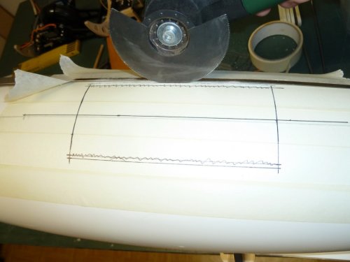 Den Rumpf hab ich dazu mit Malerband versehen und die Klappen dort gemäß der Anleitung des WEMO-Hybridfahrwerks angezeichnet und gefühlt zehnmal kontrolliert, bevor ich zu meinem Akku-Multitool mit sehr dünner Holz-Trennscheibe gegriffen habe.