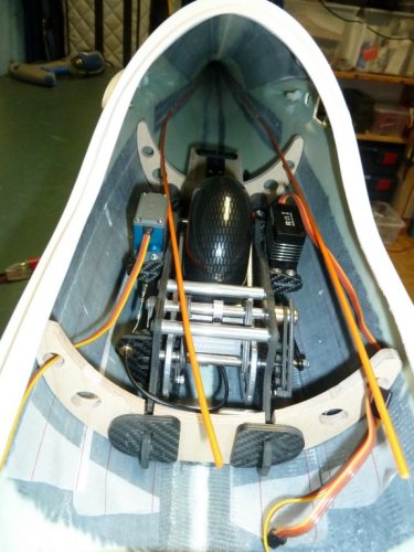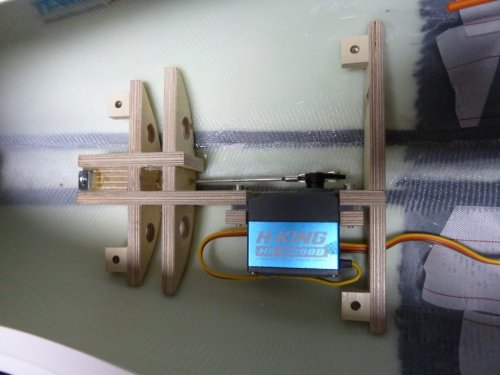Abschließend habe ich noch die Anlenkung des Seitenruders fertiggestellt. Dazu wurde das rote Bowdenzug-Außenrohr massiv gekürzt, was im Rumpfinneren nicht ganz trivial ist. Statt eines Stahlseils verwende ich beschichteten GfK-Bowdenzug, der durch das Rest-Bowdenzugrohr geführt wird. Zusammen mit den speziellen, dünnen Gewindehülsen kann ich den Bowdenzug im Notfall wieder durch das Rohr herausziehen. Die Montage war recht einfach und die selbst konstruierte Servo-Spannvorrichtung hat sich mehr als bewährt.