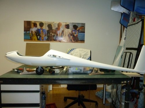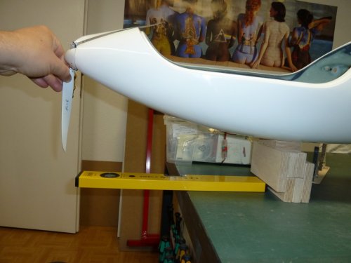 Etwas enttäuschend war die finale Messung der Bodenfreiheit. Trotz spezieller Startstellung bleiben nur etwa 52mm Bodenfreiheit (mit 14x8 Propeller). Das ist nur unwesentlich mehr als bei meinem Ventus (45mm) reicht aber auf unserem recht kurz gemähten Rasen zum Bodenstart. Wichtig ist die Lage des Rades weit vorne um ein Kippen beim Start zu verhindern. Ein "normales" FES-Fahrwerk ist wegen seiner "Storch-Optik" Aufgrund der verlängerten Fahrwerksschenkel absolut keine Alternative für mich. Sollte die Bodenfreiheit nicht reichen, werde ich auf einen 13x10 Propeller zurückgreifen.