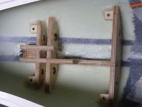 Letztlich ist das Ergebnis aber sehr brauchbar und zweckmäßig. Das Original-Akkuauflagebrett wurde längs etwas beschnitten, damit es, mit Schrauben befestigt, auf dieser Konstruktion Platz nimmt. Dadurch liegt der Akku etwas tiefer und kann noch etwas weiter nach hinten. Wie bei den anderen Scale-Fliegern von mir auch ist im vorderen Teil der Konstruktion der entnehmbare Flitschenhaken (mit Powermagneten im Klemmbereich damit der Ring ohne Zug nicht runterfällt) sowie die Schleppkupplung am Rumpfboden. Alles natürlich außerhalb des (angelegten) Propellers.