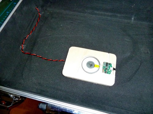 Im Senderkoffer selber habe ich das Gegenstück des Drahtlos-Ladeadapters in einer speziell dafür gefrästen Sperrholzhalterung platziert. Der Ladeadapter musste vorher natürlich seines gewohnten Gehäuses beraubt werden. Der Micro-USB-Anschluss wurde dank des am anderen Adapter abgelöteten Anschlusskabels adaptiert.
