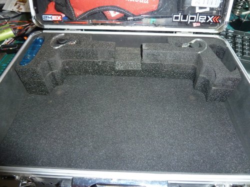 Diese modifizierte Folie wurde auf die Unterseite des Sendergehäuses geklebt, damit Sender und Senderkoffer keine Kabelverbindung benötigen, die ich sicher im Eifer des Gefechtes oft genug übersehen würde, was nicht zielführend für die Senderlebensdauer wäre.