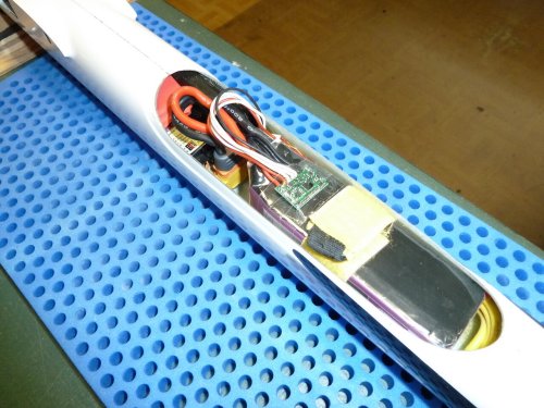 Dann war da noch die Unterbringung der restlichen RC-Komponenten (Empfänger, Regler etc.). Hier hat sich die Nutzung eines RC-Bretts, das man mit einer Schraube am Rumpf sichert bewährt. Daher hab ich ein solches Brett konstruiert und gefräst. Die Besonderheit hier ist der fest eingebaute XT-60 Stecker mit fest verlötetem (UniLog) Stromsensor. Damit sind die Kabel sauber verlegt und das anstecken des Akku geht wesentlich leichter von der Hand.