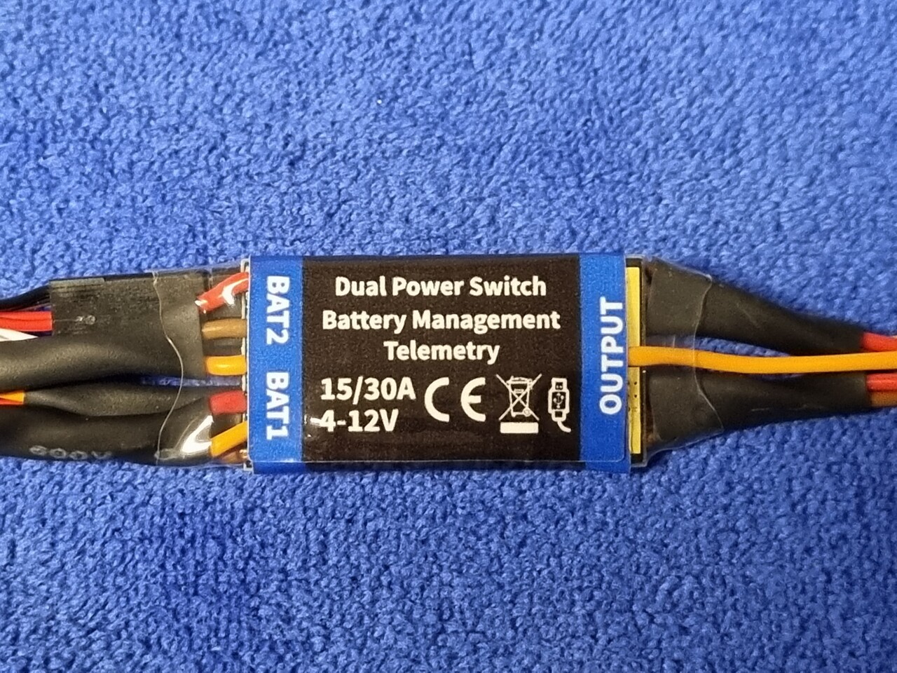 Dazu muss aber der umlaufende Aufkleber vorsichtig entfernt werden, damit er später wieder Verwendung finden kann. Danach wird der Schrumpfschlauch vorsichtig entfernt. Die Lötpads sind deutlich zu erkennen Unterhalb der Bat1 Lötpads). Daran wird das zusätzliche Spannungsversorgungskabel angelötet (Polung beachten und vorher ausmessen). Das Signalkabel lasse ich durch den Voltario führen und befestige an dessen Ende (Länge richtet sich nach Einbausituation) auch eine rotes Servo-Steckergehäuse. Das Kabel kann mit einem winzigen Klecks Heißkleber auf der Platine fixiert werden. Nach dem Test kann die Platine wieder eingeschrumpft werden und der Aufkleber wieder vorsichtig aufgebracht werden. Hier bitte die Position der beiden LEDs beachten, die den aktuell aktiven Akkueingang anzeigen.