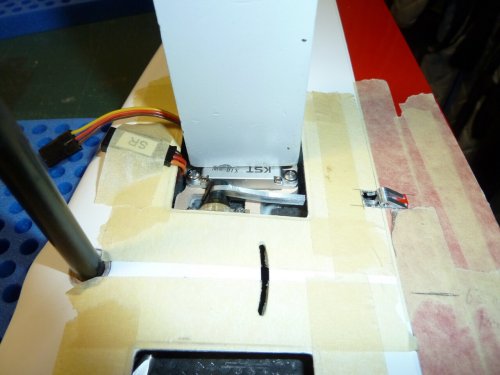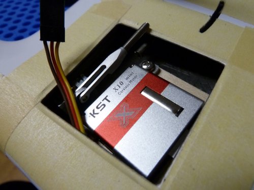 Beide Ruder werden über KST X10 mini angesteuert. Um unnötiges Kabelgewirr zu vermeiden, nutze ich üblicherweise die Version mit nur 5cm Anschlusskabel. Die jeweiligen Verlängerungen nach vorne zum Empfänger liegen dem Modell bei und sind passgenau.