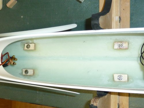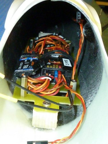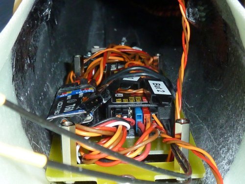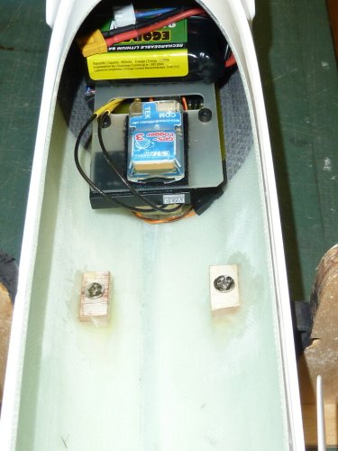 Dieser sitzt auf einer RC-Platte, die im hinteren Teil in einem geschlitzteb Holzklotz klemmt, der an den Rumpfboden geklebt wurde. Im vorderen Bereich wird die Platte durch eine M4-Schraube gesichert, die ebenfalls in einen am Rumpfboden befestigten Holzklotz geschraubt wird. Somit ist die ganze Einheit ohne Probleme entnehmbar und beheimatet, mit Ausnahme des Reglers, alle RC-Komponenten. Vorne im "Sichtfenster" des GfK-Bereiches des Rumpf sind die empfangsrelevanten Komponenten (Empfängerantenne, GPS-Logger, RC-Switch) positioniert.