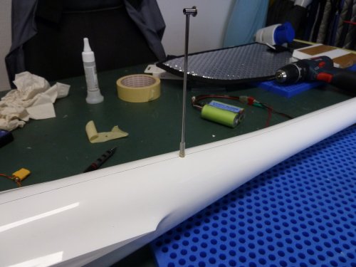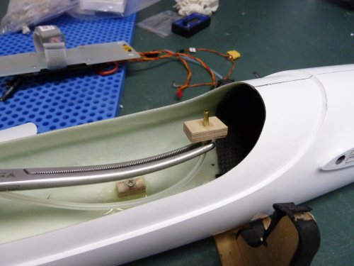 Um das Rohr im Rumpf vernünftig fixieren zu können hab ich ein kleines Sperrholzplättchen vorbereitet, das mittig ein 3mm Loch bekommen hat. Darin wurde das Rohr eingeklebt. Nun kam der spannende Teil. Der bestand darin diese Baugruppe in das im Rumpfrücken vorbereitete Loch zu bugsieren, mitsamt dem am anderen Ende des Rohres montierten Silikonschlauchs. Hier hat sich wieder einmal meine 40cm lange Edelstahlklemme bewährt. Ohne diese wäre es nicht möglich gewesen, das mit Klebeharz benetzte Bauteil im Rumpf zum Loch zu führen.
