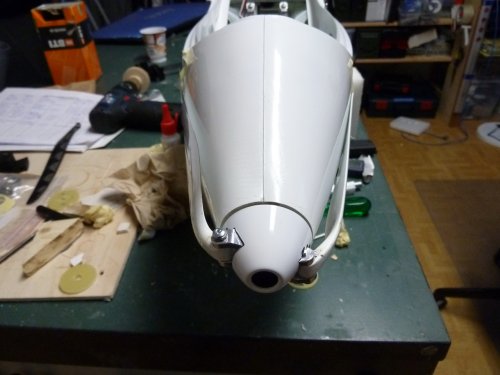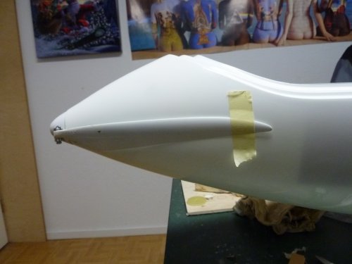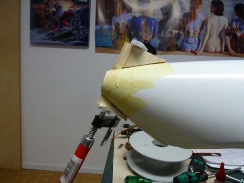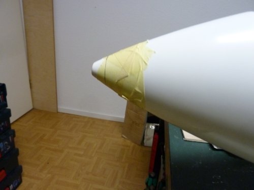 Zuerst wurde, wie immer, der Rumpf mit Kreppband abgeklebt und eine Schnittkante mit Bleistift angezeichnet. Danach trat die Virbrationssäge an um die Rumpfspitze in wenigen Sekunden abzutrennen. Ziel war es, die spitze Rumpfform mit einem entsprechend spitzen 32mm Spinner abzubilden. Das hat so aber nicht geklappt. Das 30mm Mittelteil war viel zu breit und die Klapplatten haben viel zu weit ausgekragt, was einerseits doof aussieht und andererseits den Luftwiderstand unnötig erhöht. Also ging Plan B in Richtung 38mm Spinner. Das sah aber auch nicht toll aus, weshalb ich letztlich bei einem 40mm RFM-Scalespinner mit 32mm Mittelteil gelandet bin.