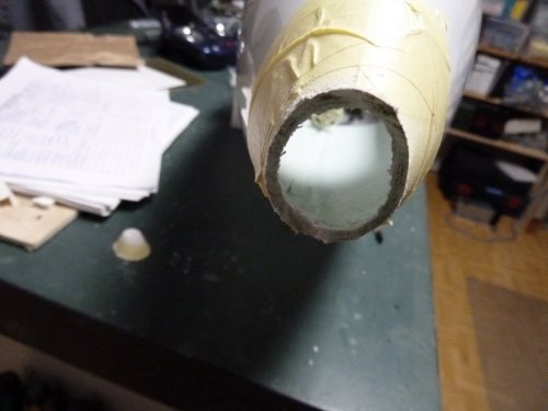 Dann war da noch das Problem mit der ovalen Rumpfform. Eine Spannvorrichtung mit M6 Schraube war zwar effizient, jedoch vermag diese Vorrichtung nicht, den "Hubbel" oben an die Spantform anzugleichen. Nach einigen Überlegungen hab ich daher eine Druckvorrichtung gebastelt. Dazu hab ich die Nase mit Krappband abgeklebt und Holzkeile mittels Schmiege angefertigt. Diese wurden mit Heißkleber auf das Kreppband geklebt um der Schraubzwinge zu ermöglichen, den Rumpf in Form zu drücken ohne abzurutschen. Nachdem die gewünschte Form erreicht war, wurde der Spant eingepasst und verklebt. Nach dem aushärten des Hatz wird die Rumpfspitze noch mit dem Fön getempert, um die Spannung wieder aus dem Material zu nehmen. Hier muss mit der Temperatur vorsichtig vorgeganegn werden, damit keine Spuren am Gewebe hinterlassen werden.
