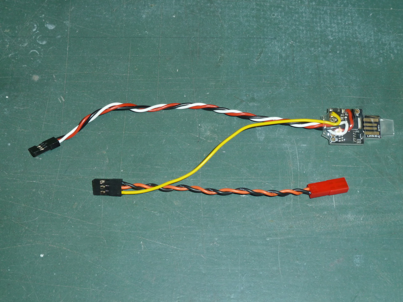 Vom Servoanschluss am Empfänger gehen die Plus- bzw. Minusleitungen zu den Spannungsversorgungspins am DigiStump. Das Servosignal wird bei meiner Lösung an den Ausgang P2 angeschlossen. Das Steuersignal für die KSQ liegt dann am Ausgang P0. Der P1 ist intern mit der roten LED auf der Platine verbunden und wird als Monitor genutzt, damit man die Blitzfunktion auch ohne angeschlossene KSQ sehen kann bzw. die Servoposition so einstellen kann.